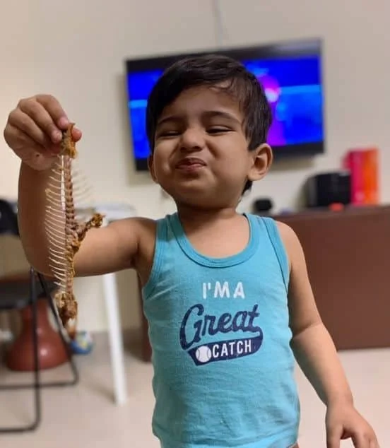 Image description: a two-and-a-half-year-old toddler boy, holding a fish bone and pursing his lips! Thank you to his mom for sharing her photo.