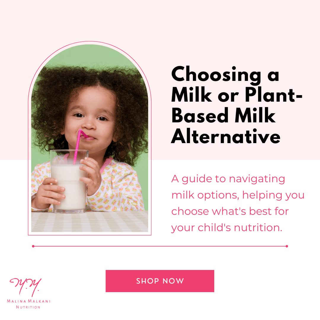 When choosing a milk alternative for your child, it is best to offer plain, unsweetened fortified soy milk as it is minimally processed and has a high quality, digestible complete protein, unlike most other plant-based milks.