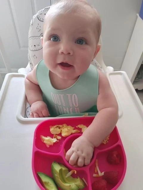A 6-month old girl eating solids! Big thanks to her parents for sharing.